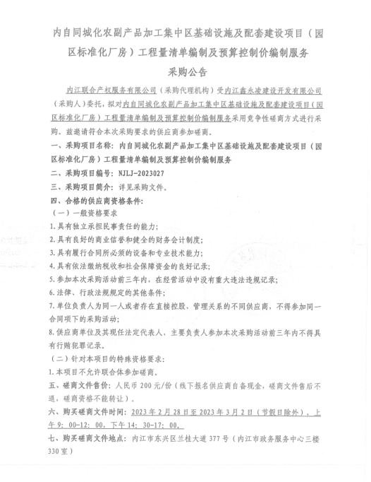 内自同城化农副产品加工集中区基础设施及配套建设项目(园区标准化厂房)工程量清单编制及预算控制价编制服务采购公告