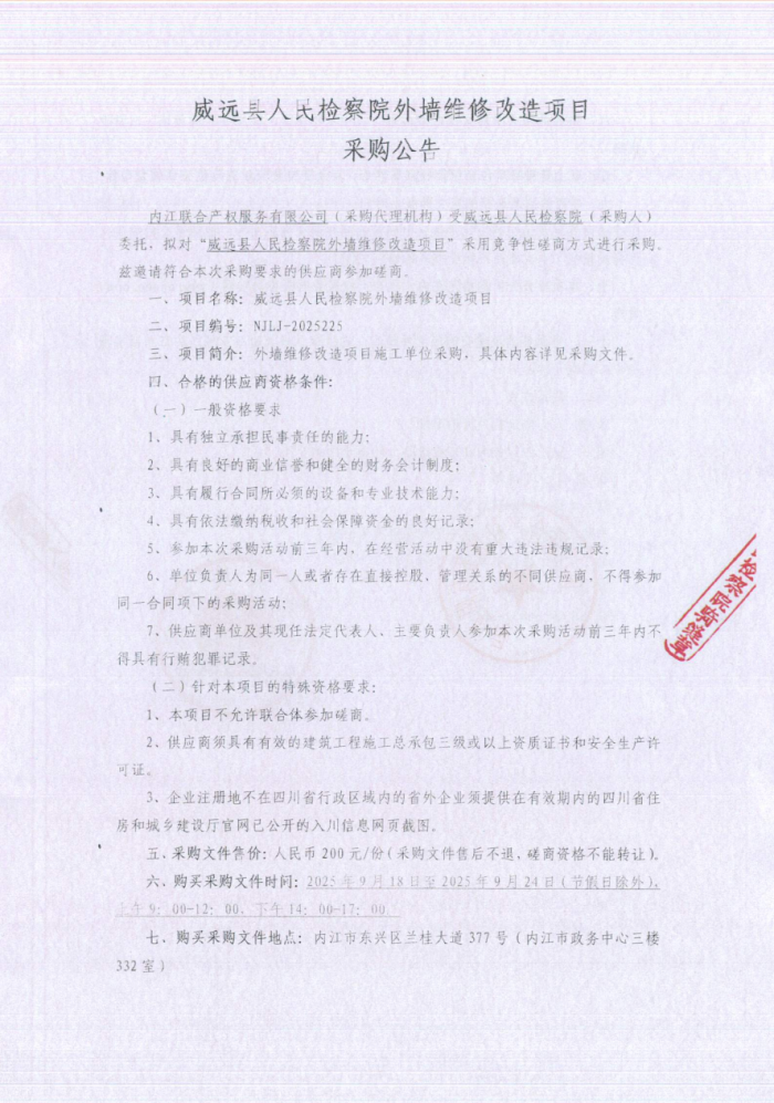 威远县人民检察院外墙维修改造项目采购公告