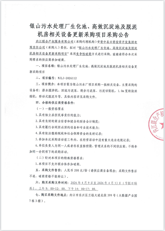 银山污水处理厂生化池、高效沉淀池及脱泥机房相关设备更新采购项目