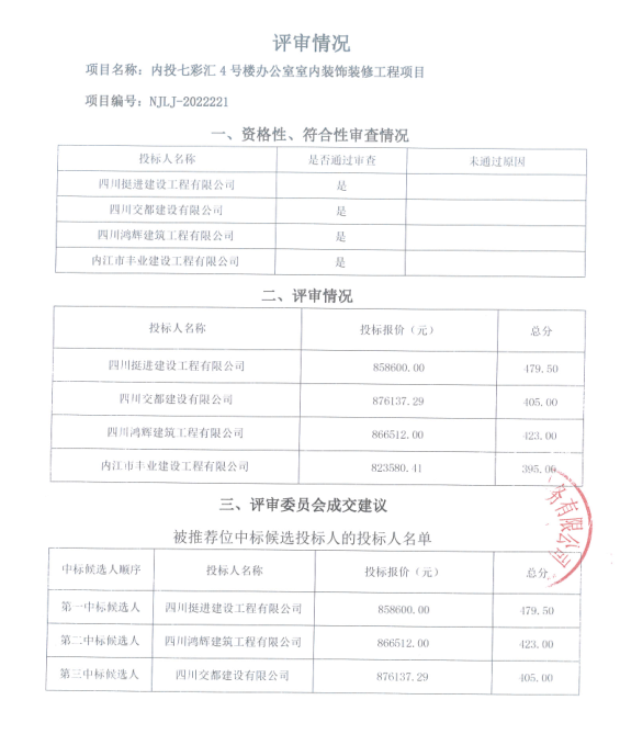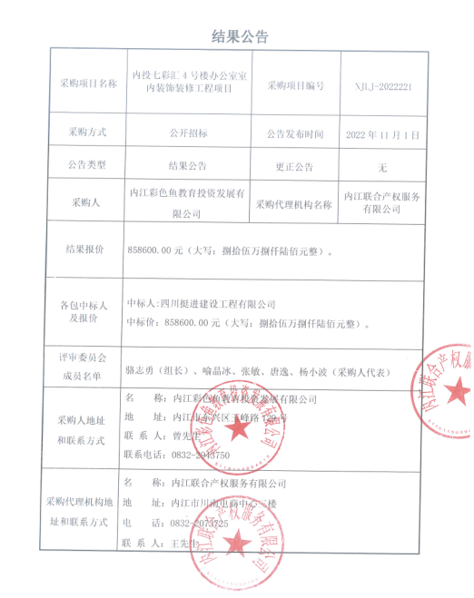 内投七彩汇4号楼办公室室内装饰装修工程项目结果公告