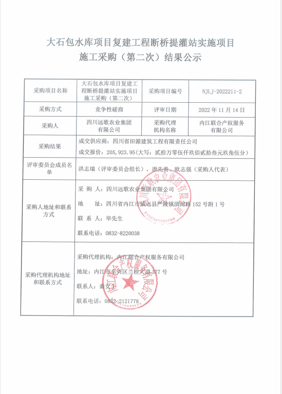 大石包水库项目复建工程断桥提灌站实施项目施工采购(第二次)结果公示