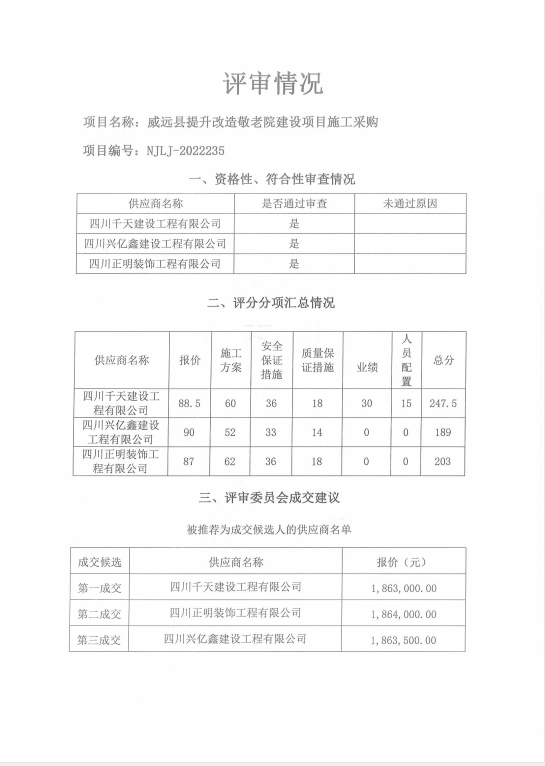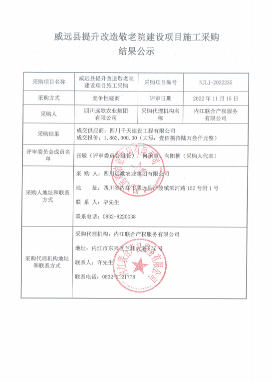 威远县提升改造敬老院建设项目施工采购结果公示