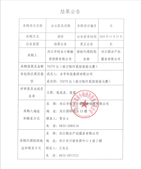 内江市创业小额融资担保有限公司办公家具采购结果公告