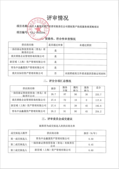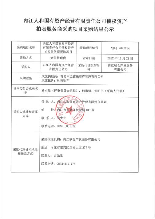 内江人和国有资产经营有限责任公司债权资产拍卖服务商采购项目结果公告