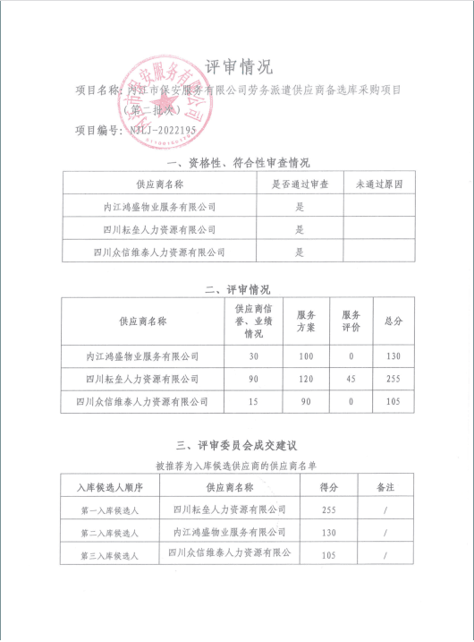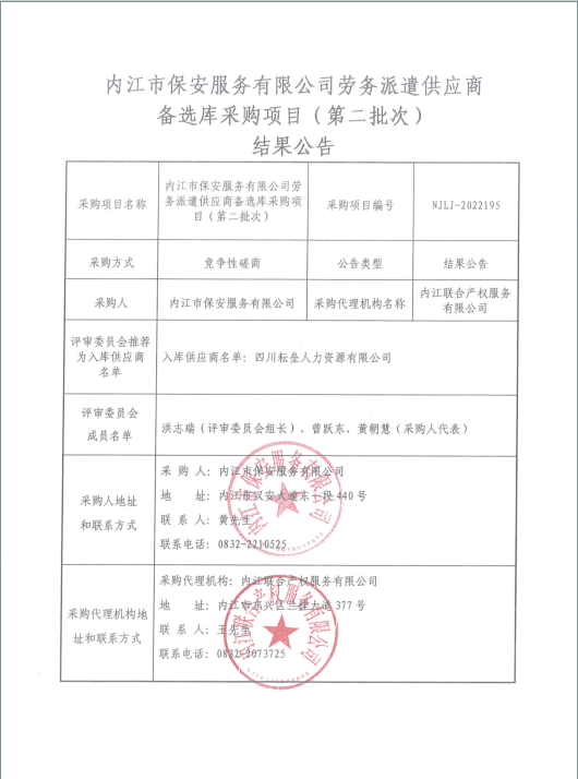 内江市保安服务有限公司劳务派遣供应商备选库采购项目(第二批次)结果公告