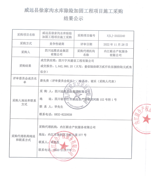 威远县徐家沟水库除险加固工程项目施工采购结果公示