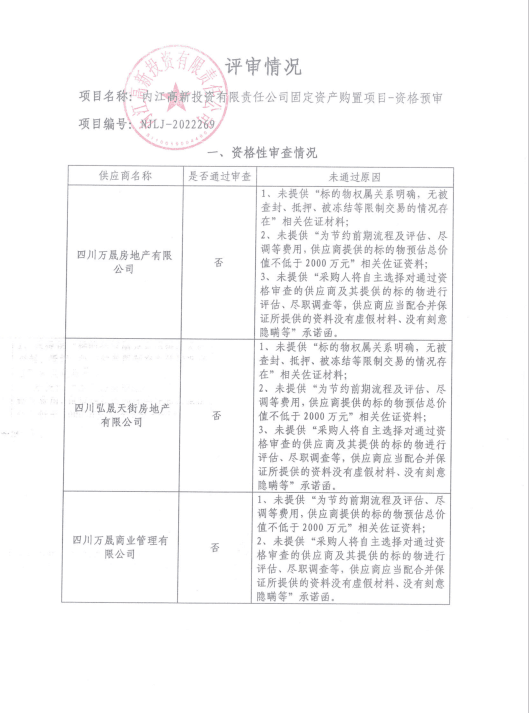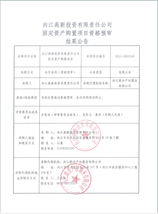 内江高新投资有限责任公司固定资产购置项目资格预审结果公告