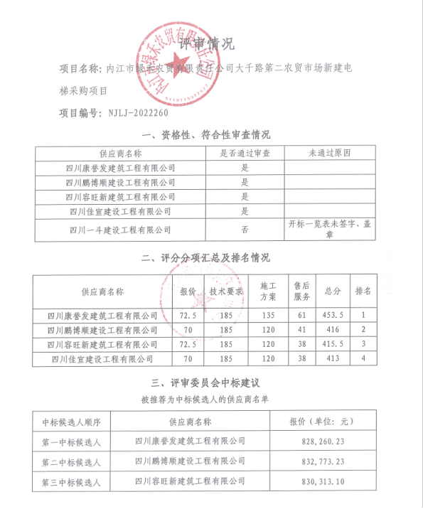 内江市绿禾农贸有限责任公司大千路第二农贸市场新建电梯采购项目结果公告