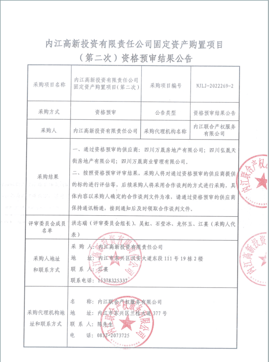 内江高新投资有限责任公司固定资产购置项目(第二次)资格预审结果公告