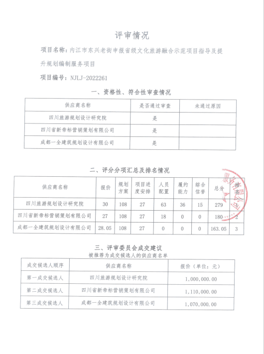 内江市东兴老街申报省级文化旅游融合示范项目指导及提升规划编制服务项目结果公告