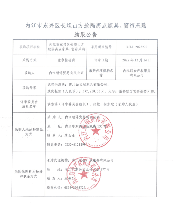 内江市东兴区长坝山方舱隔离点家具、窗帘采购结果公告