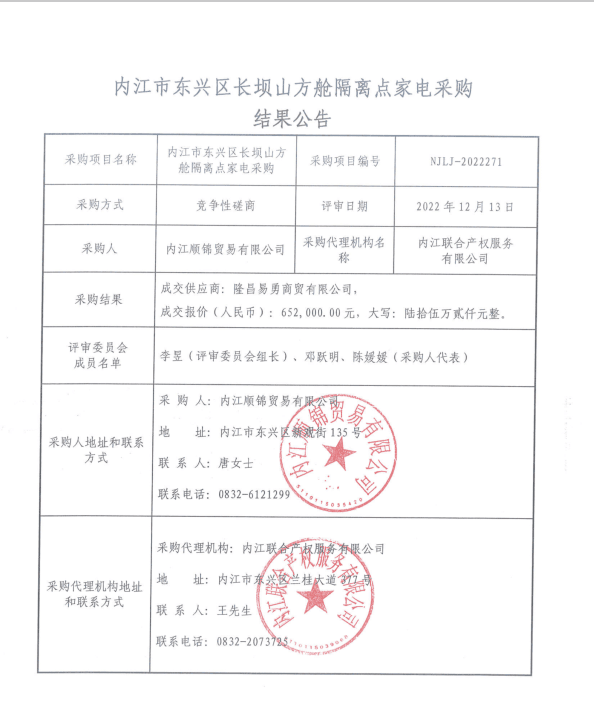 内江市东兴区长坝山方舱隔离点家具、窗帘采购结果公告