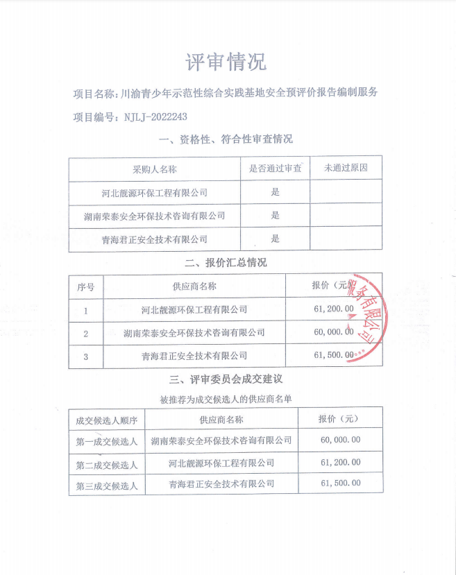 川渝青少年示范性综合实践基地安全预评价报告编制服务结果公告
