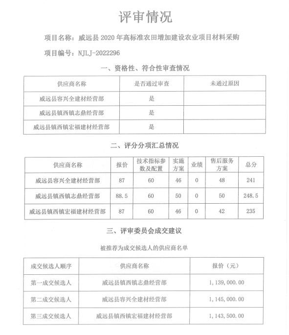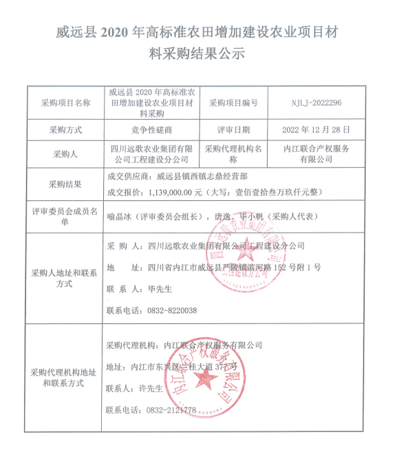 威远县2020年高标准农田增加建设农业项目材料采购结果公示