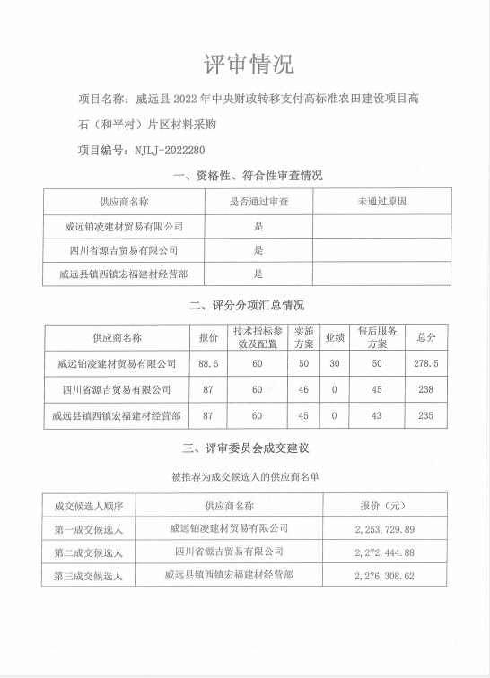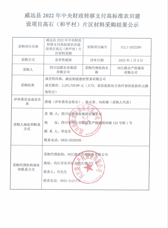 威远县2022年中央财政转移支付高标准农田建设项目高石(和平村)片区材料采购结果公示