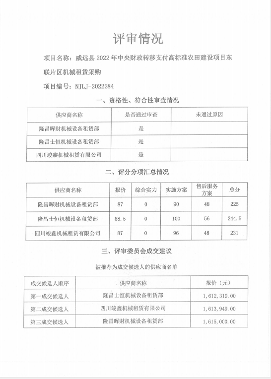 威远县2022年中央财政转移支付高标准农田建设项目东联片区机械租赁采购结果公示
