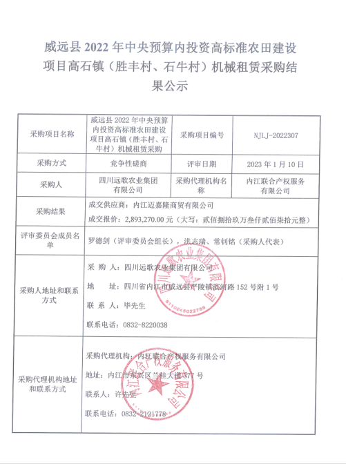 威远县2022年中央预算内投资高标准农田建设项目高石镇(胜丰村、石牛村)机械租赁采购结果公示