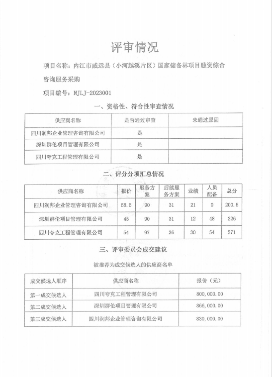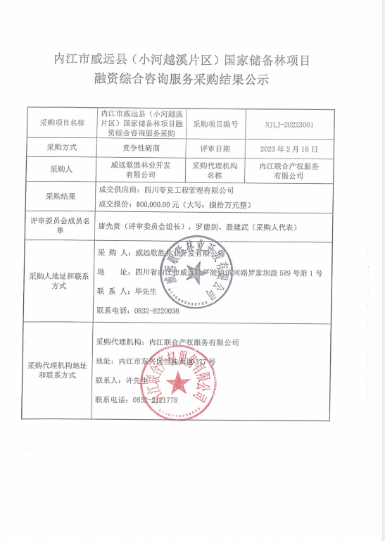 内江市威远县(小河越溪片区)国家储备林项目融资综合咨询服务采购结果公示