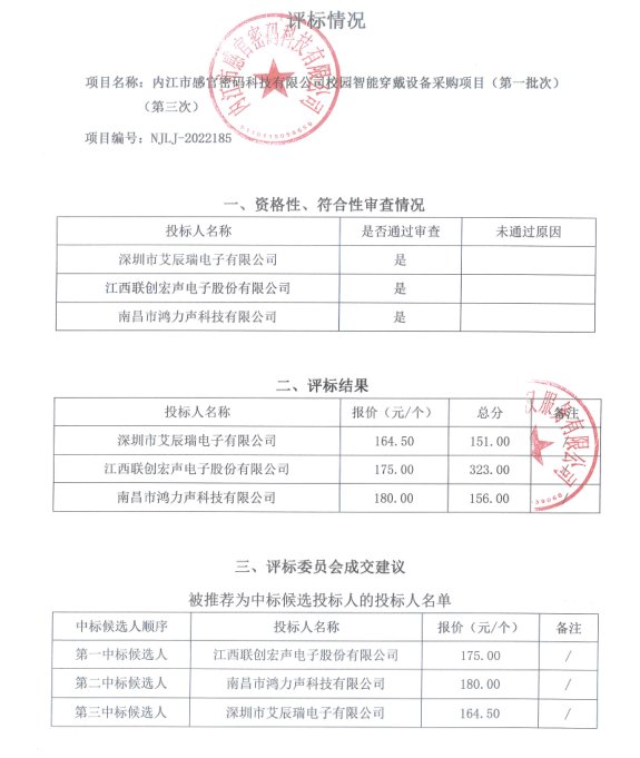 内江市感官密码科技有限公司校园智能穿戴设备采购项目(第一批次)(第三次)结果公告