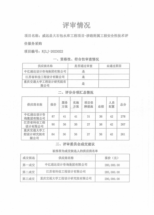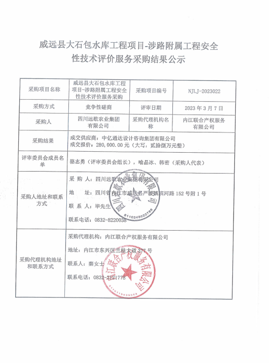 威远县大石包水库工程项目-涉路附属工程安全性技术评价服务采购结果公示