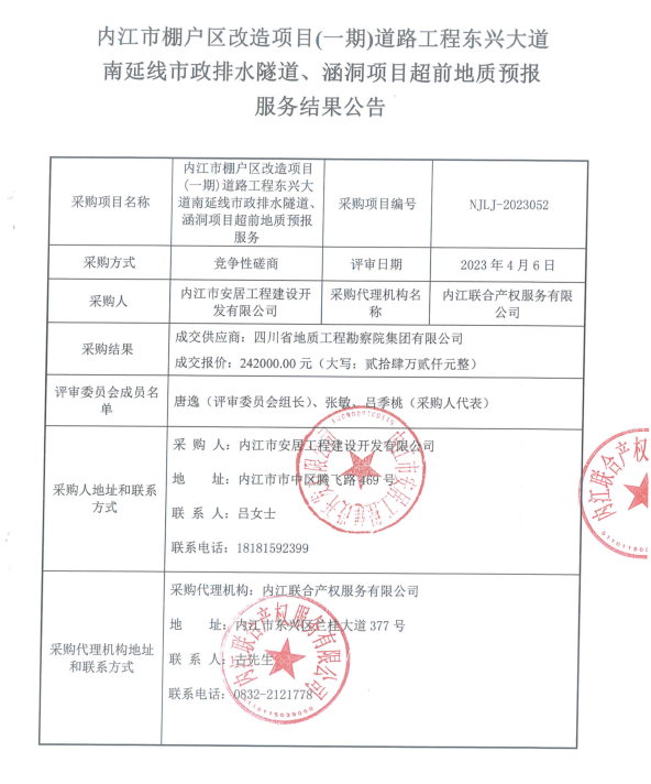 内江市棚户区改造项目(一期)道路工程东兴大道南延线市政排水隧道、涵洞项目超前地质预报服务结果公告