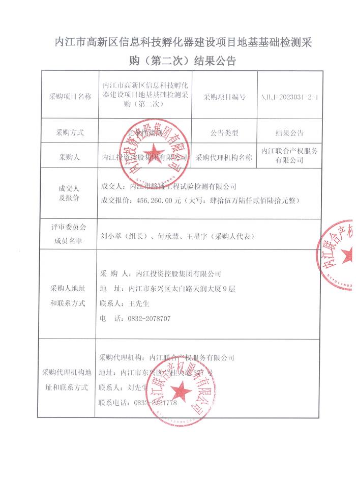 内江市高新区信息科技孵化器建设项目地基基础检测采购(第二次)结果公告