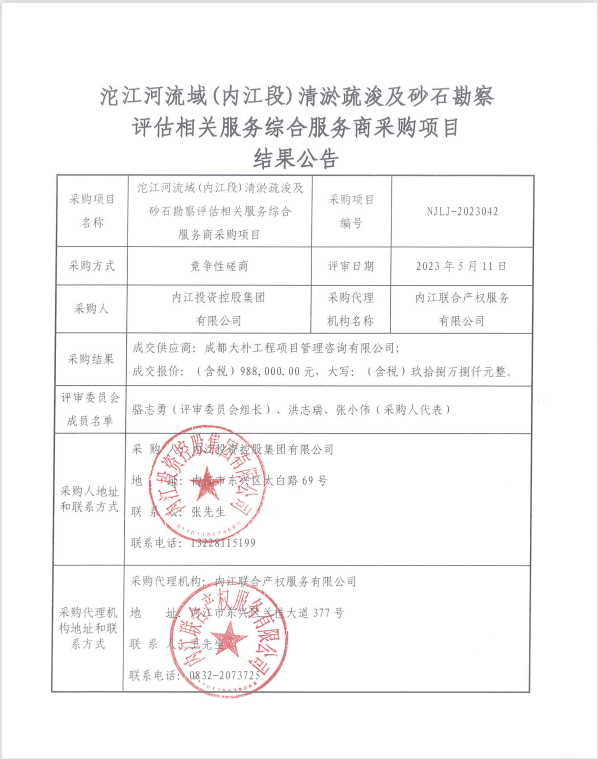 沱江河流域(内江段)清淤疏浚及砂石勘察评估相关服务综合服务商采购项目结果公告