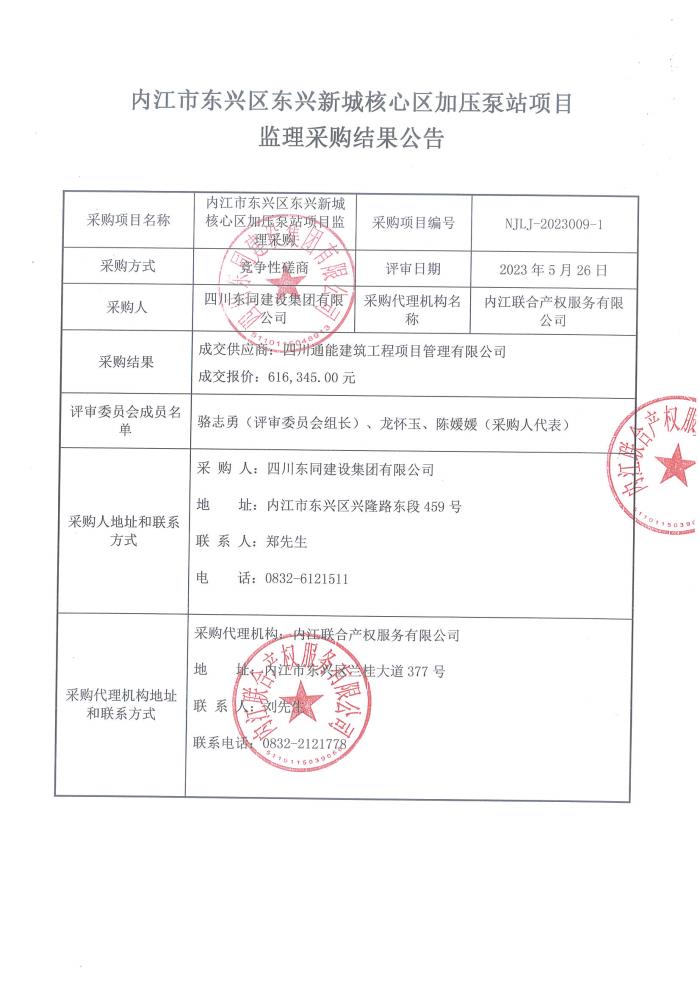 内江市东兴区东兴新城核心区加压泵站项目监理采购结果公告