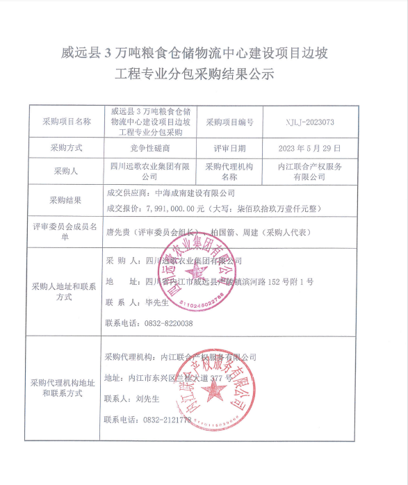 威远县3万吨粮食仓储物流中心建设项目边坡工程专业分包采购结果公示