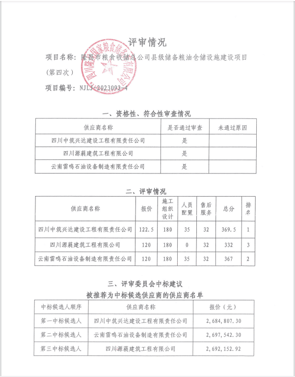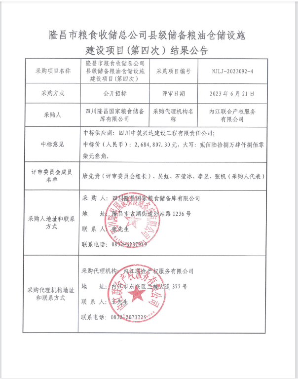 隆昌市粮食收储总公司县级储备粮油仓储设施建设项目(第四次)结果公告
