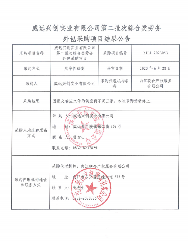 威远兴创实业有限公司第二批次综合类劳务外包采购项目结果公告