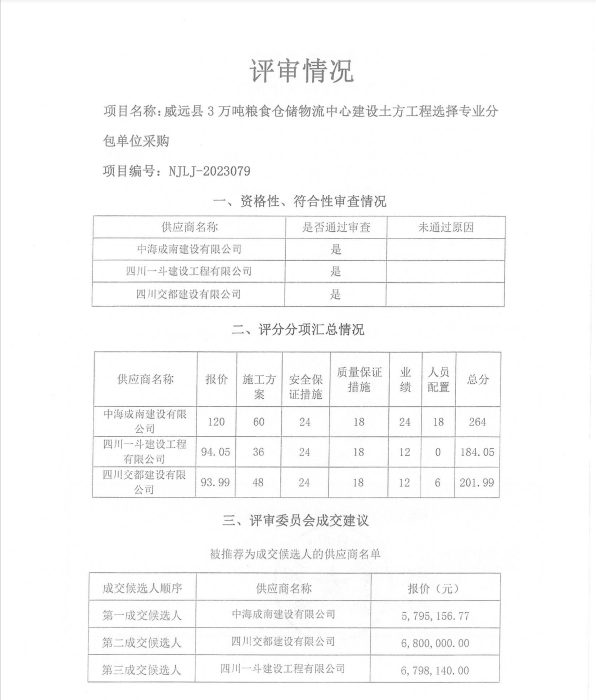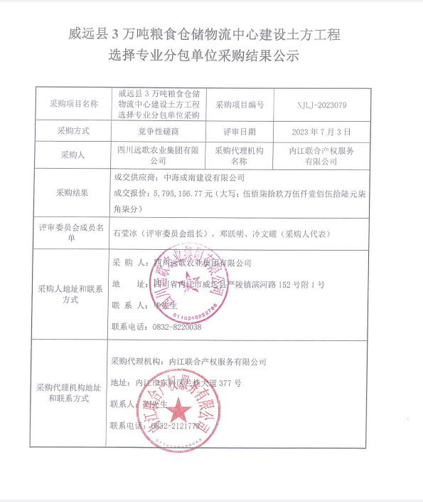 威远县3万吨粮食仓储物流中心建设土方工程选择专业分包单位采购结果公示