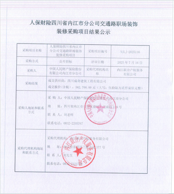人保财险四川省内江市分公司交通路职场装饰装修采购项目结果公示
