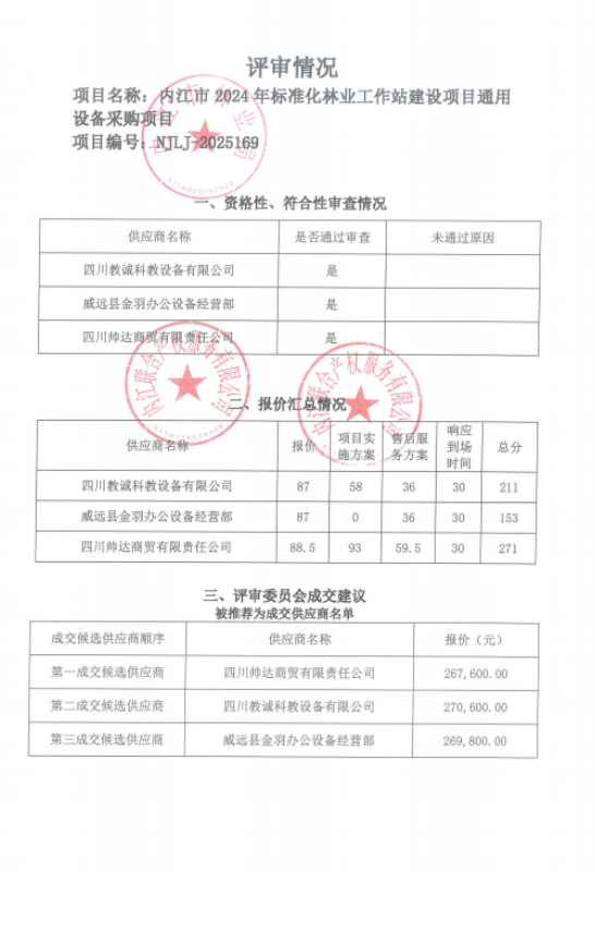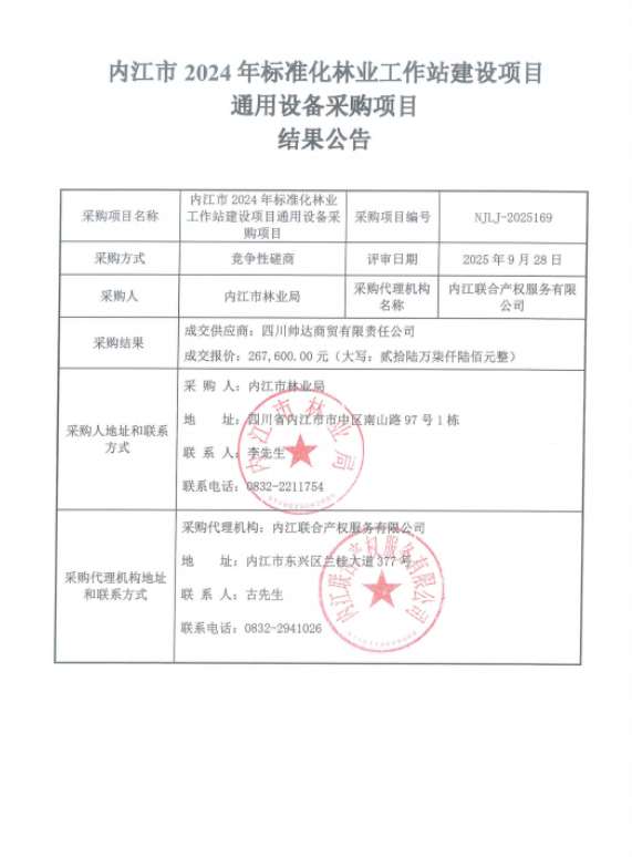 内江市2024年标准化林业工作站建设项目通用设备采购项目结果公告