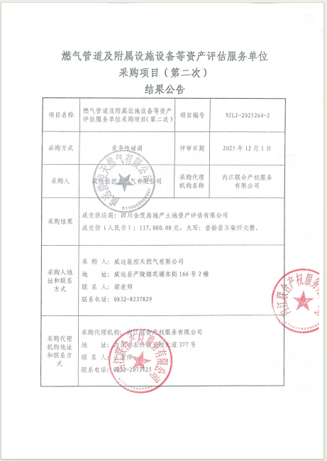 燃气管道及附属设施设备等资产评估服务单位采购项目(第二次)结果公告
