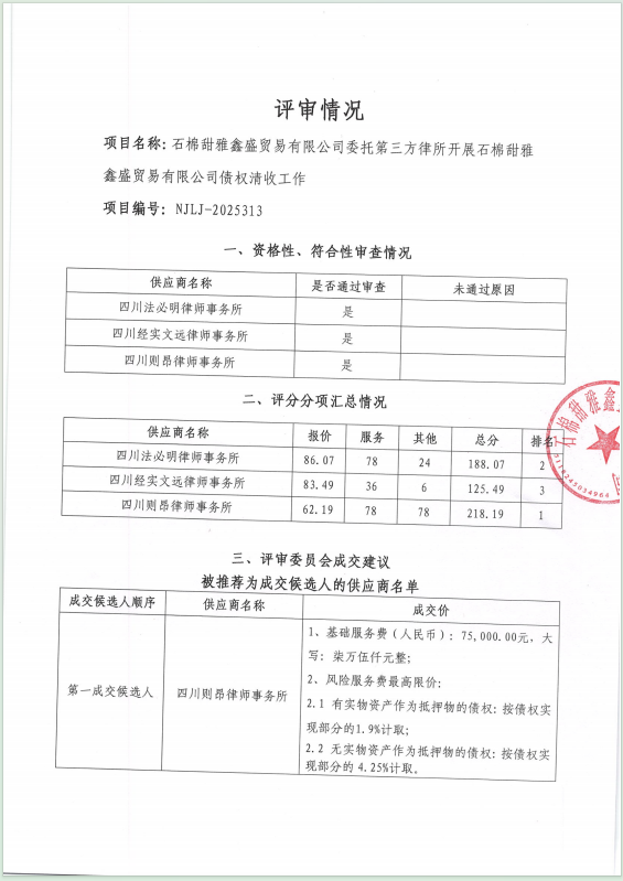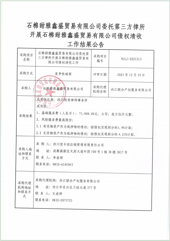 石棉甜雅鑫盛贸易有限公司委托第三方律所开展石棉甜雅鑫盛贸易有限公司债权清收工作结果公告
