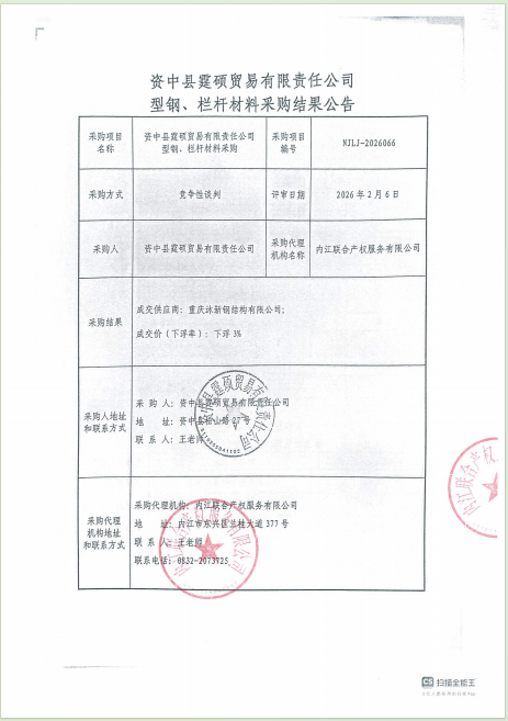 资中县霆硕贸易有限责任公司型钢、栏杆材料采购结果公告